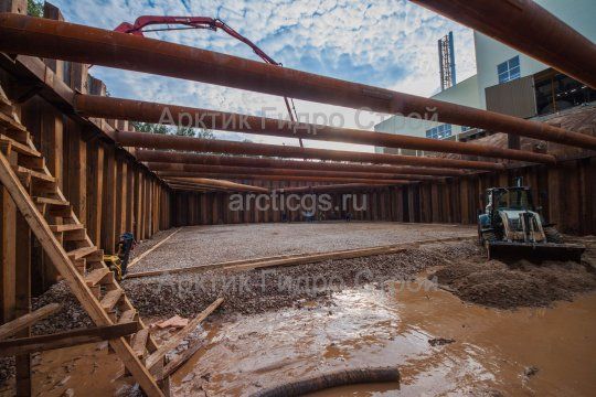 - подкосы – опираются на шпунты и на грунт (подошву фундамента, дополнительные сваи).